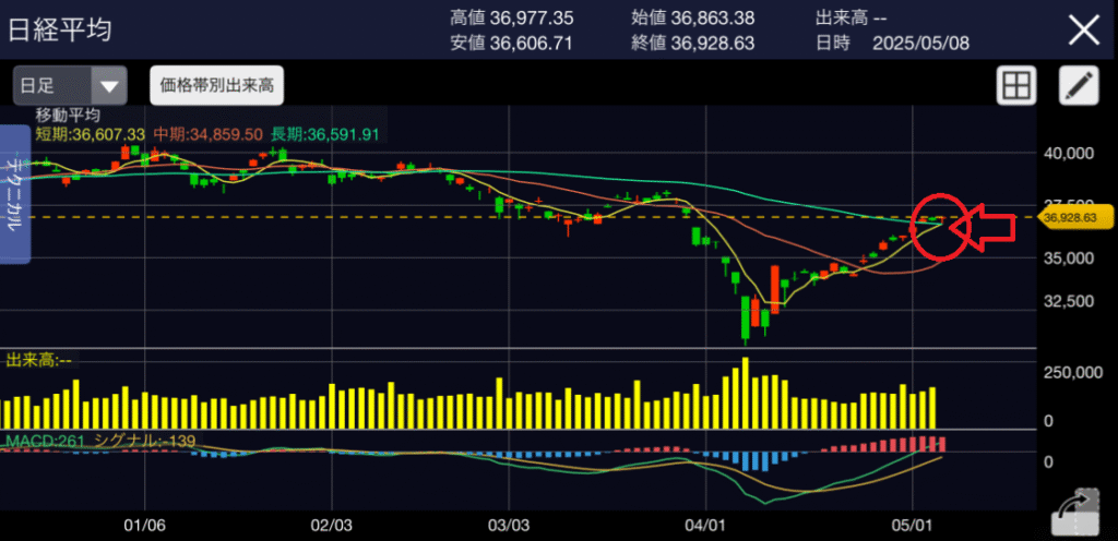 日足の変化は、ほとんどないものの5MAが60MAに接しましたので徐々に相場は強くなってきているようです。しかしながらMACDはやや過熱を示しているので一時的に売られる可能性もあります。37000円をどのように超えていくのか?また超えれずに再度下落相場に陥っていくのか?これからが楽しみです。
